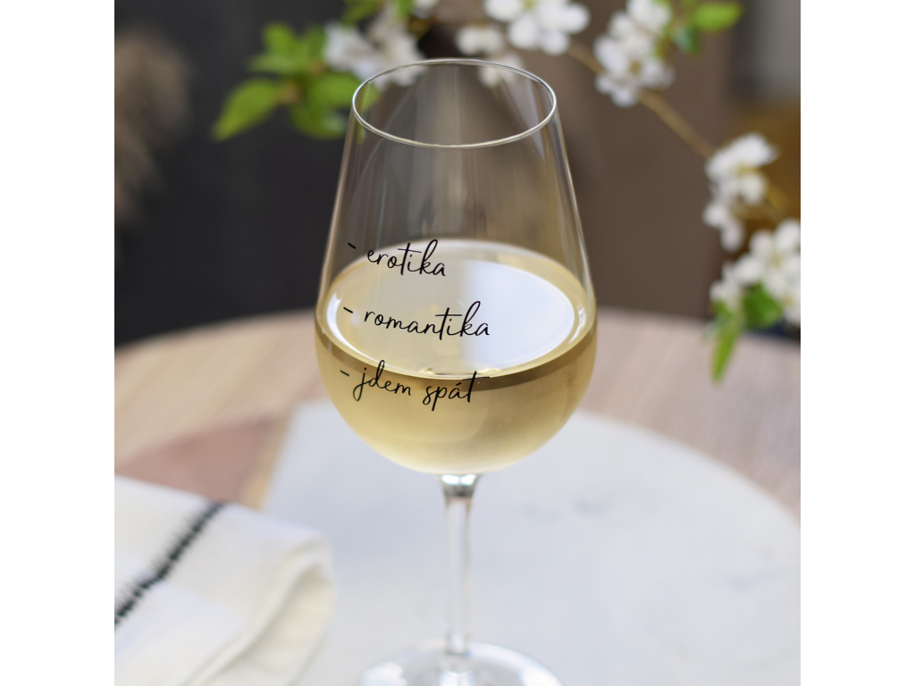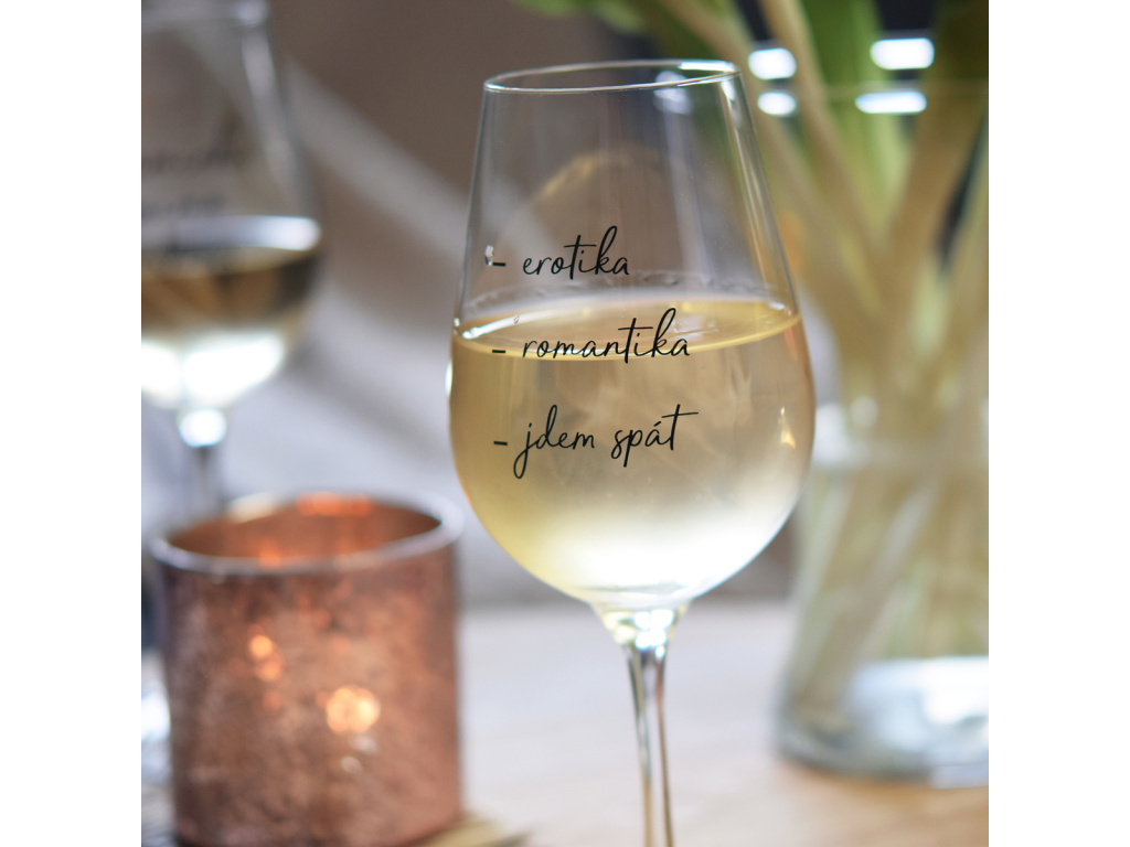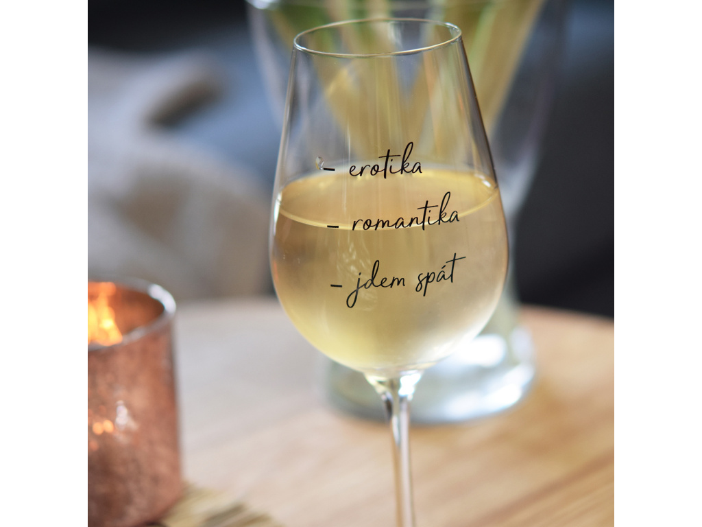 Sklenice na víno - "Erotika, romantika, jdem spát."