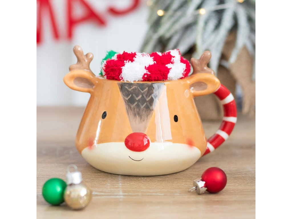 Tato slavnostní sada keramických hrnků a ponožek představuje skvělý dárek k Vánocům! Zaoblený sobí hrnek je vyplněn párem nadýchaných pruhovaných ponožek, které vás udrží v pohodlí i v chladném počasí.