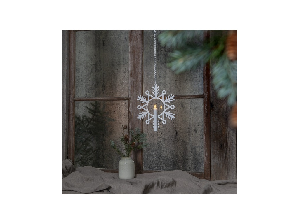 Bílá sněhová vločka z kovu, včetně pěkně vypadající starožitné svíčky Flamme v délce 15 cm. Skvělé k dekoraci do okna nebo na zeď. Vyhněte se pověšení na přímém slunci, protože vosková svíčka se může teplem roztavit.