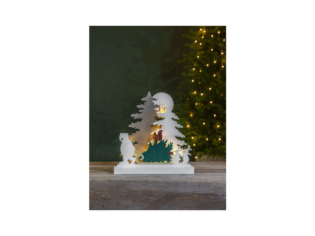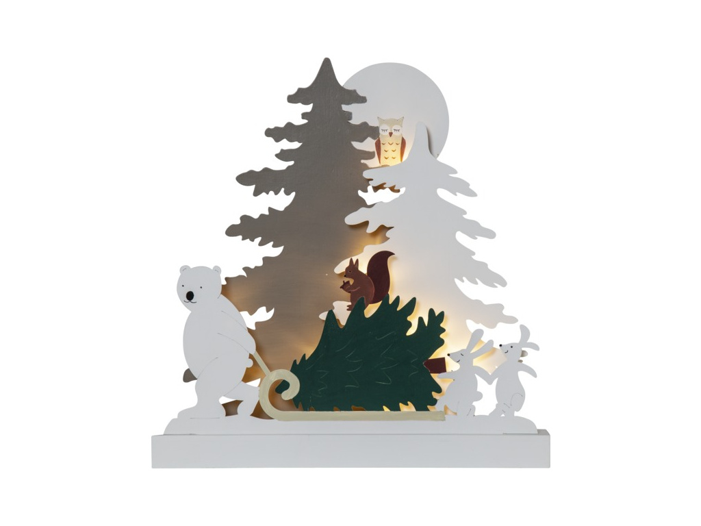 Dekorativní scenérie ze dřeva. Lední medvěd táhne vánoční stromek na lesní mýtinu, aby oslavil Vánoce se svými přáteli. Malé LED diody osvětlují objekt a vytvářejí náladový pocit. Výrobek je napájen baterií a má funkci časovače.