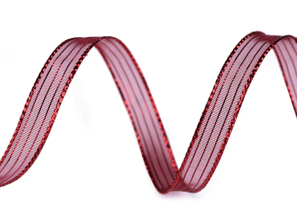 Třpytivou dekorační stuhu zdobí proužky z lurexu. Je pevná, oboustranná, uvázané mašle drží pěkně tvar.
