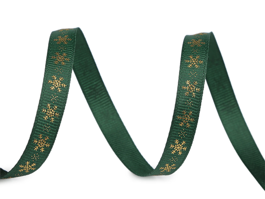 Vánoční rypsová stuha vločky zelená šíře 10 mm