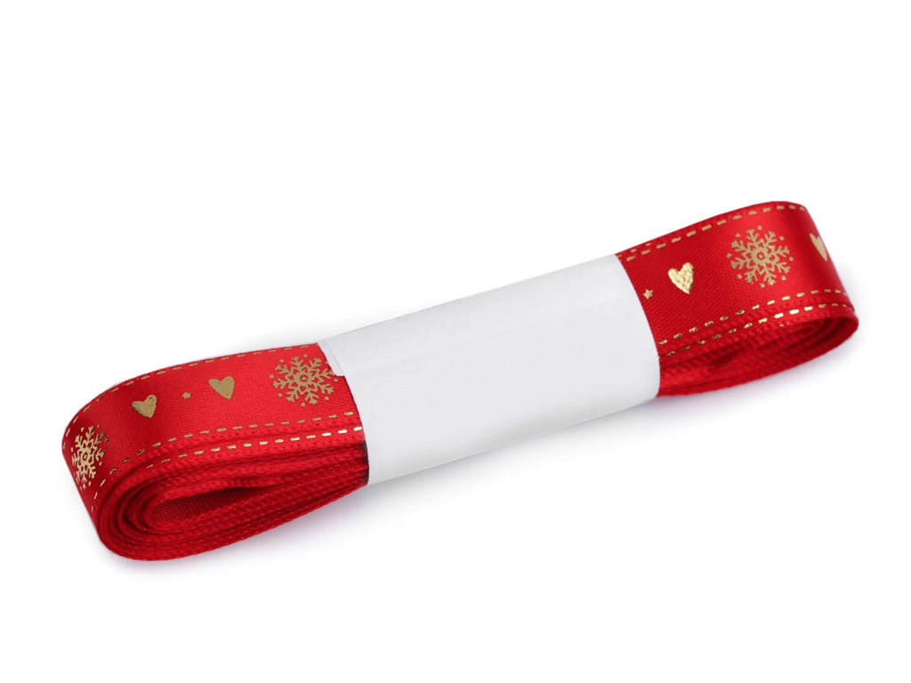 Dekorační saténová stuha s potiskem srdcí a vloček je velice poutavá. Potisk je jednostranný, metalický, připomíná lurex.