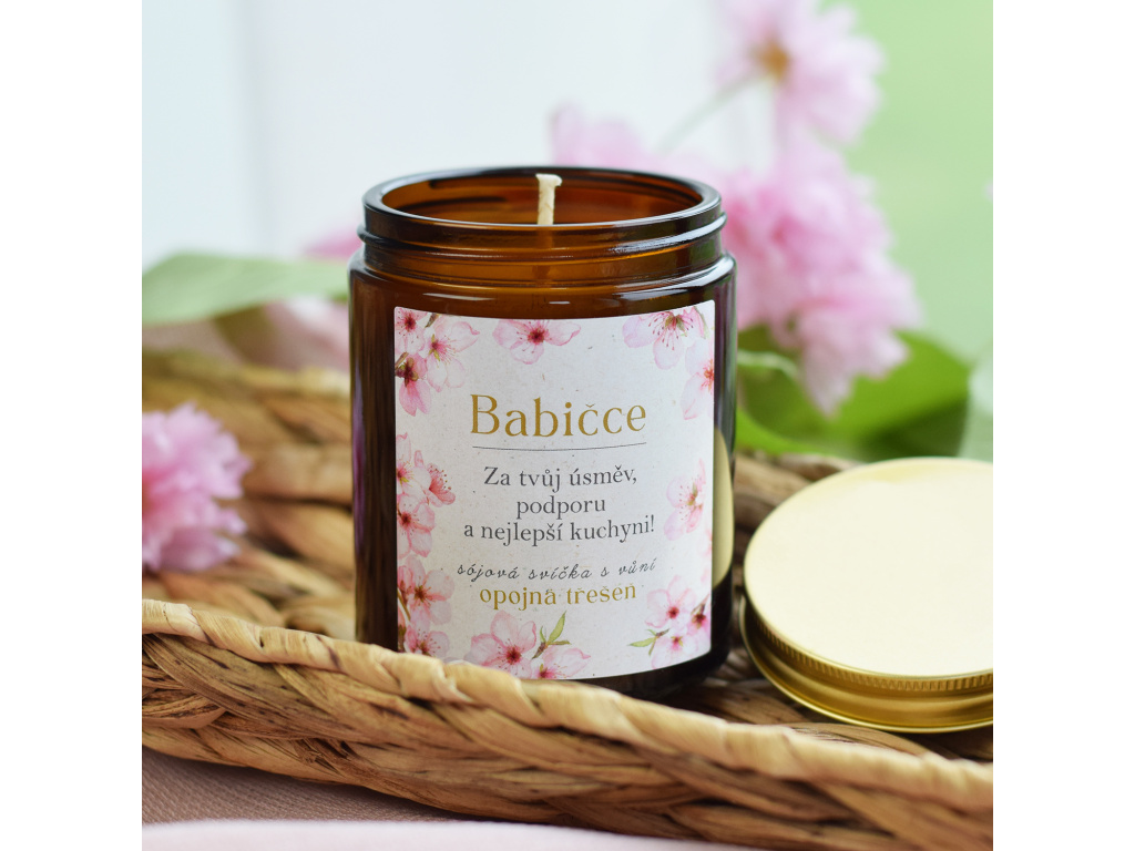 Dárková svíčka v hnědém skle se zlatým víčkem plněná přírodním voskem a neodolatelnou vůní opojné třešně!