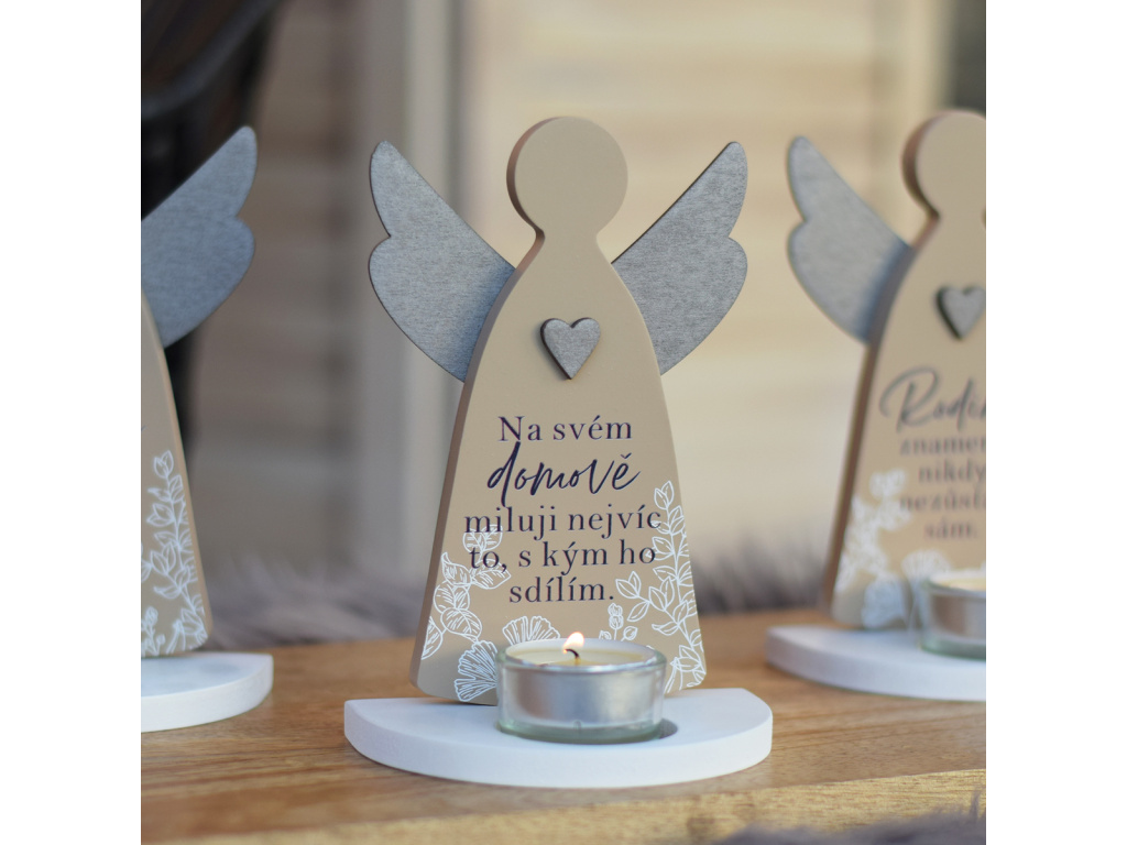 Svíčku v tomto krásném moderním svícnu s motivem anděla si rádi zapálíte v podzimních i zimních odbdobí. Světlo ohně Vám vytvoří útulnou atmosféru a český nápis zahřeje u srdce.
