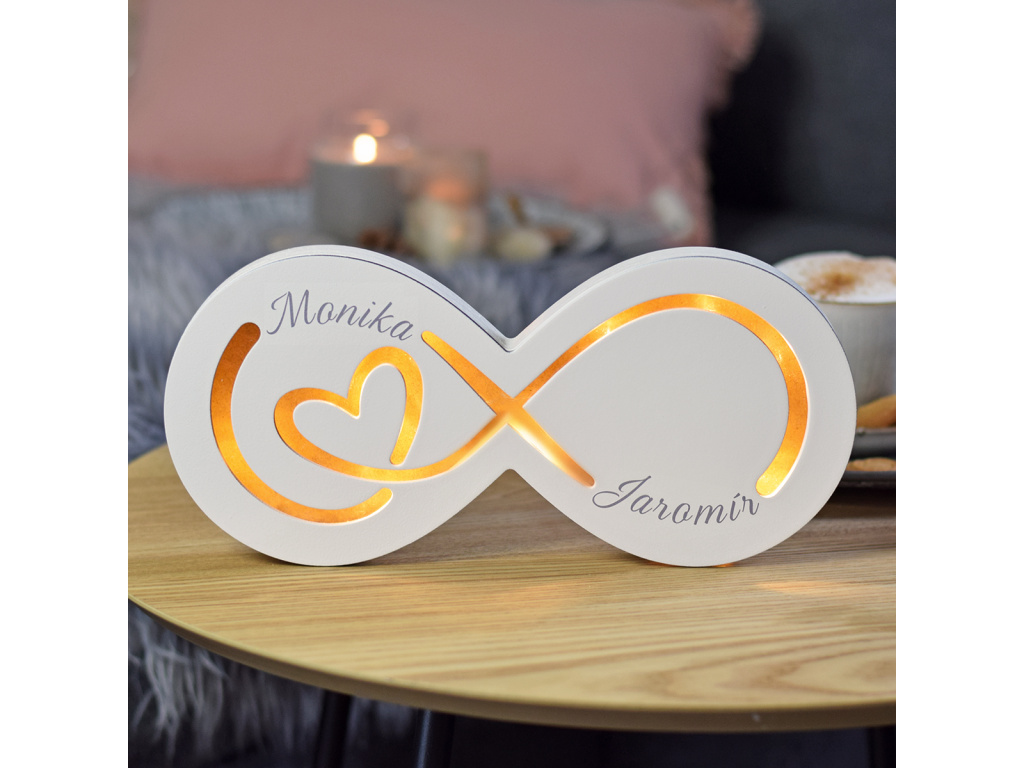 Dřevěná dekorace na míru - Pro páry Dřevěná dekorace pro zamilované páry, která bude zdobit útulně Vaše hnízdečko. Rozsviťte originálně Váš domov. Své nekonečno si můžete postavit na poličku, komodu nebo tak, kde Vám bude dělat radost.   Vybírejte ze dvou variant - bílá nebo přírodní. *Požadovaná jména uveďte do poznámky k produktu na míru při vyplnění objednávky.  Velikost: 30 x 14 x 2 cm Luxusní dekorace do bytu  MOHLO BY VÁS ZAJÍMAT : ➤ Svítící dekorace ➤ Pro páry ➤ LED řetezy ➤ Dekorační cedulky ➤ XXL hodiny ➤ Cedule na víno - CZ - tmavá / světlá ➤ Cedule na víno - SK - tmavá / světlá
