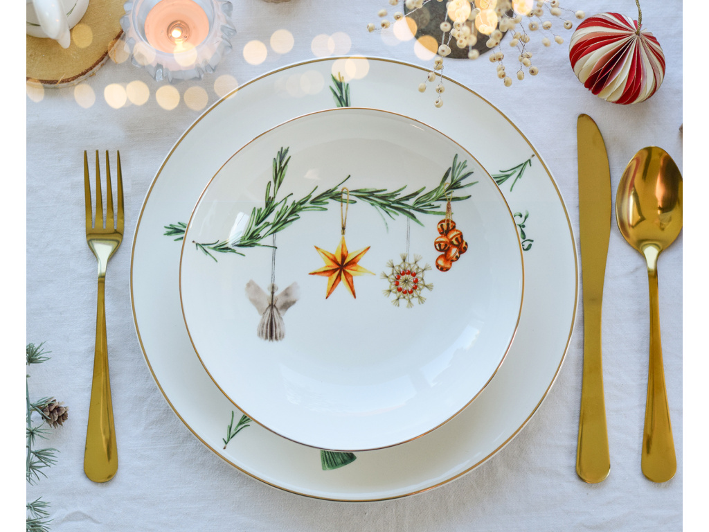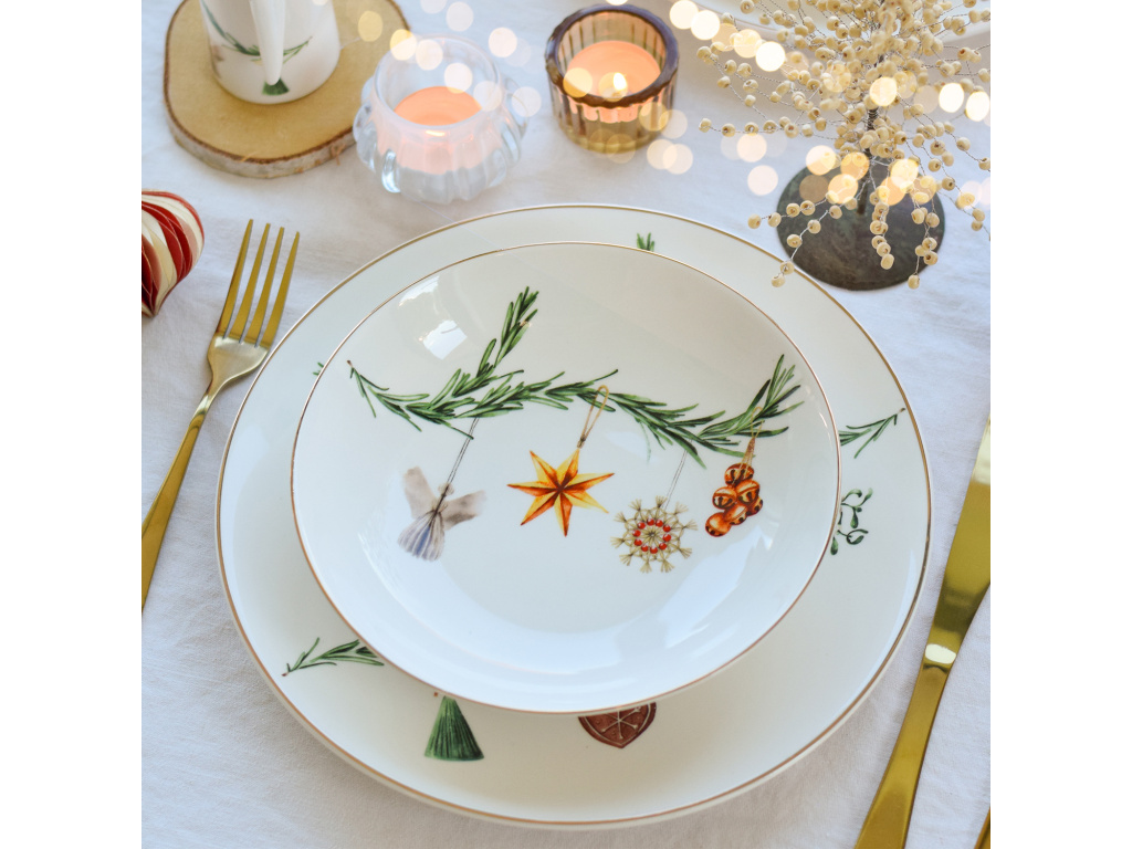 Prostřete si svůj vánoční stůl s jedinečností a stylem. Tato kolekce je je zdobená větvičkami a vánočnímmi ozdobami, které jsou ručně malované a představují symboly Vánoc. Zlatá linka na okraji talíře podtrhuje slavnostní událost jako jsou svátky vánoční.