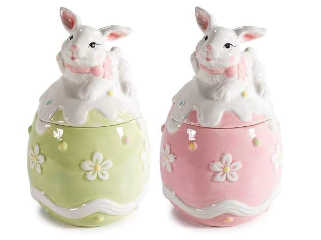 Keramické vejce na sušenky s víčkem velikonočního zajíčka a dekorativními květinovými reliéfy - velikost Ø 10,5 cm x 17,5 cm H.