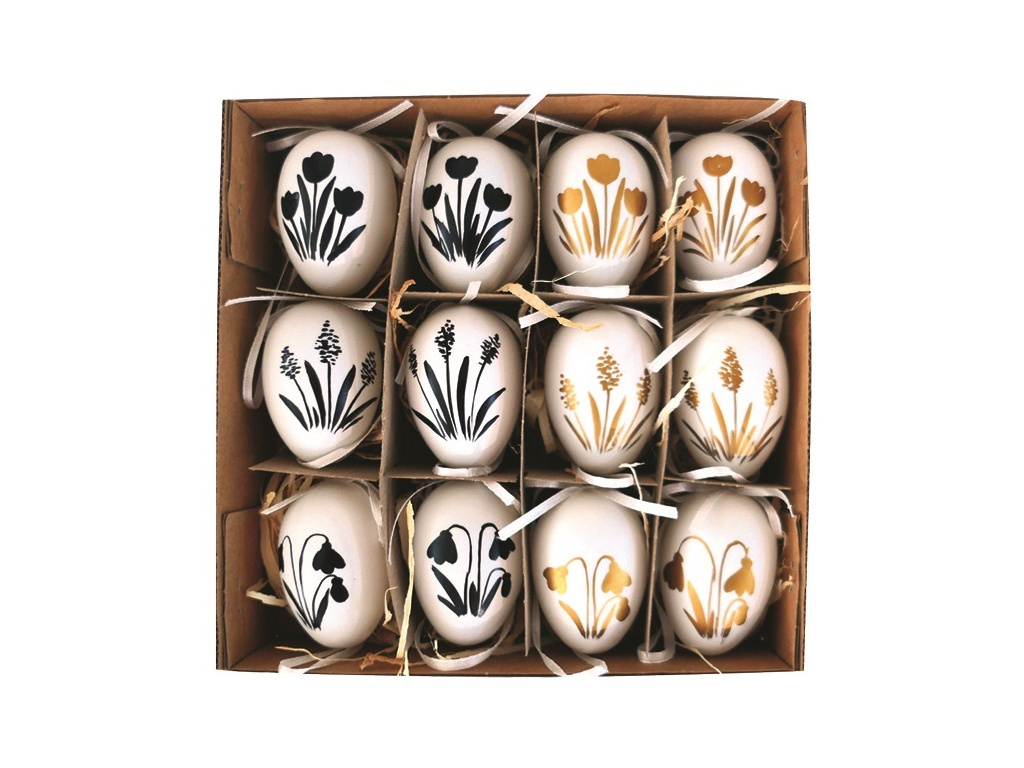 Vajíčka plastová s černým a zlatým dekorem na zavěšení 6 cm, 12 ks v krabičce