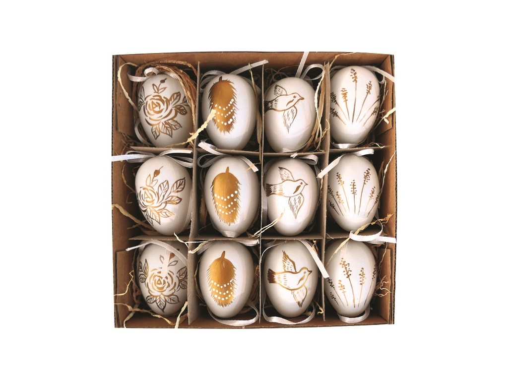 Vajíčka plastová se zlatým dekorem na zavěšení 6 cm, 12 ks