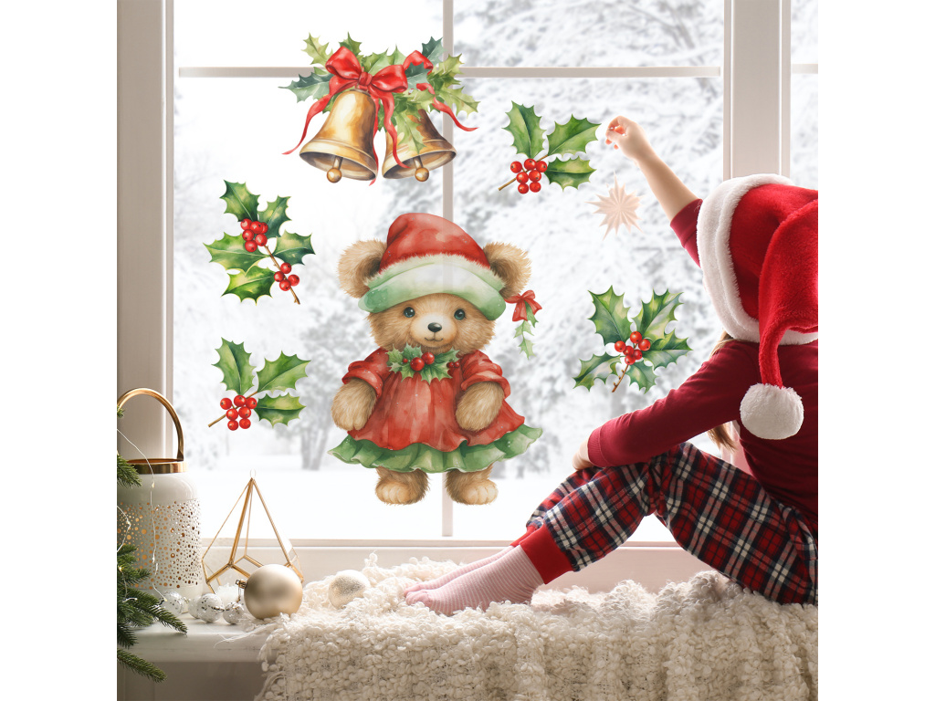 Samolepka na sklo – vánoční medvědice pro holky je oboustranná, takže její roztomilý pohled může zazářit jak dovnitř, tak ven. Je viditelná ze všech stran, takže si ji užijete ať už sedíte u stolu, nebo z okna pozorujete padající vločky.