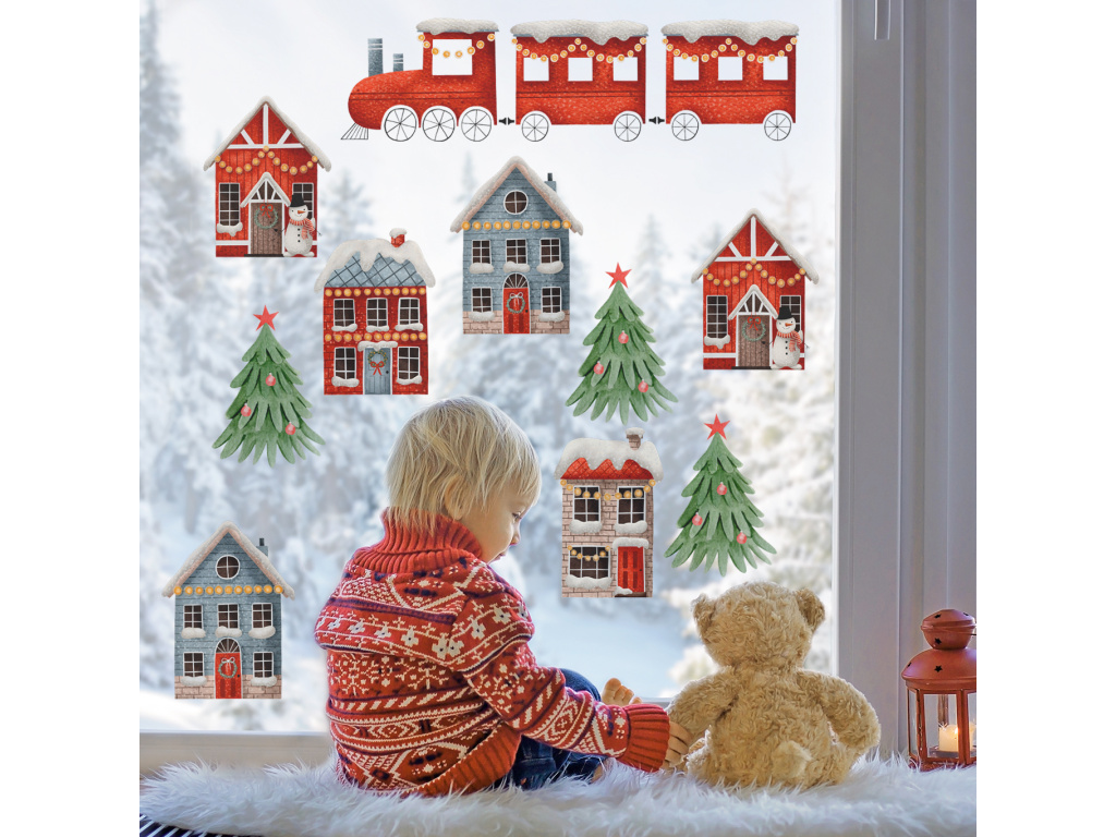 Vyzdobte svá okna pomocí této efektivní vánoční samolepky s vánočními domečky a vláčkem!