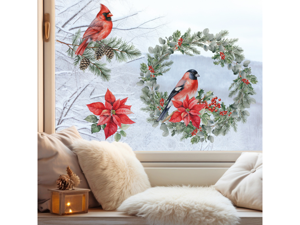 Vánoční samolepka na sklo - Vánoční věnec s ptáčky