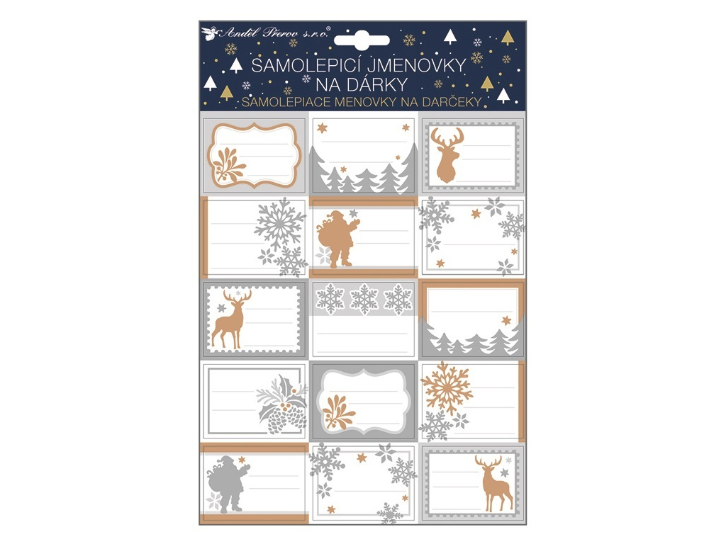 Samolepicí jmenovky na dárky Hledáte způsob, jak originálně popsat dárky? Využijte k tomu naše samolepící jmenovky s vánočními motivy! Rozměr jedné jmenovky: 6 x 4,5 cm. 15 kusů v balení, pěkné vánoční motivy s glitry.Doplňkové parametry