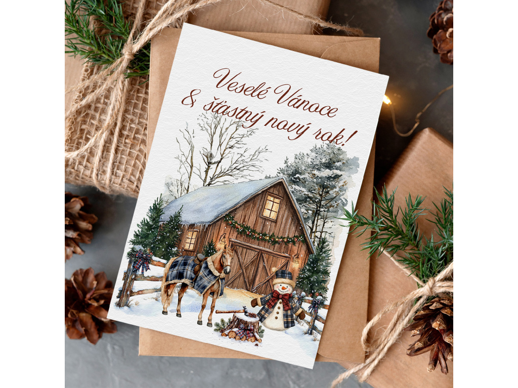 Vneste do svátečního období kouzlo zimní pohody s tímto krásným vánočním přáním. Ilustrace dřevěné chalupy zasypané sněhem, ozdobené světýlky a zelenými větvičkami, doplněná o koně s kostkovanou dekou a usměvavého sněhuláka, vytváří dokonale hřejivou atmosféru tradičních Vánoc.