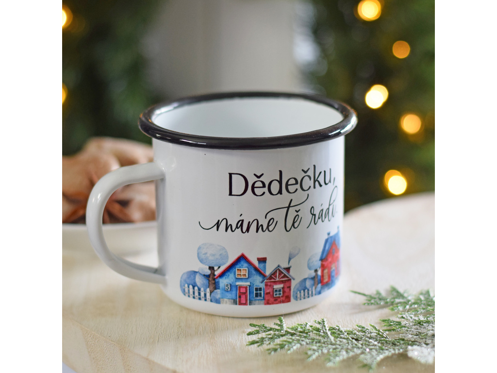 Kolekce útulných plecháčků s motivem ručně malovaného městečka. Nápoj z tohoto plecháčku si každý s radostí vychutná.