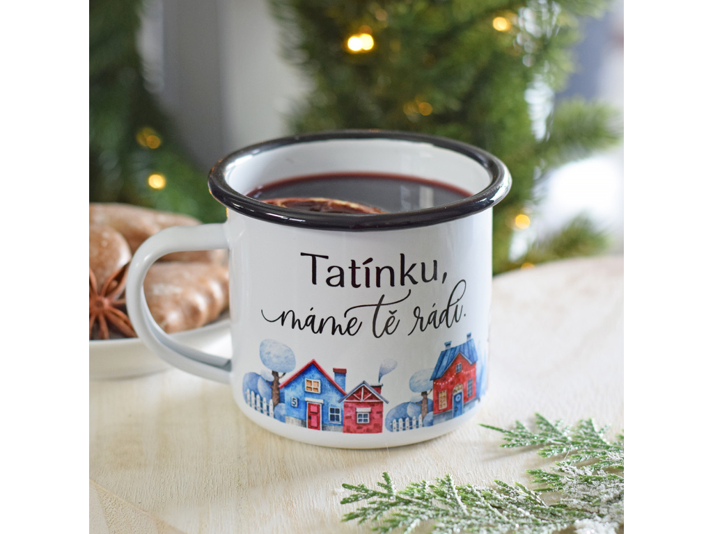 Kolekce útulných plecháčků s motivem ručně malovaného městečka. Nápoj z tohoto plecháčku si každý s radostí vychutná.