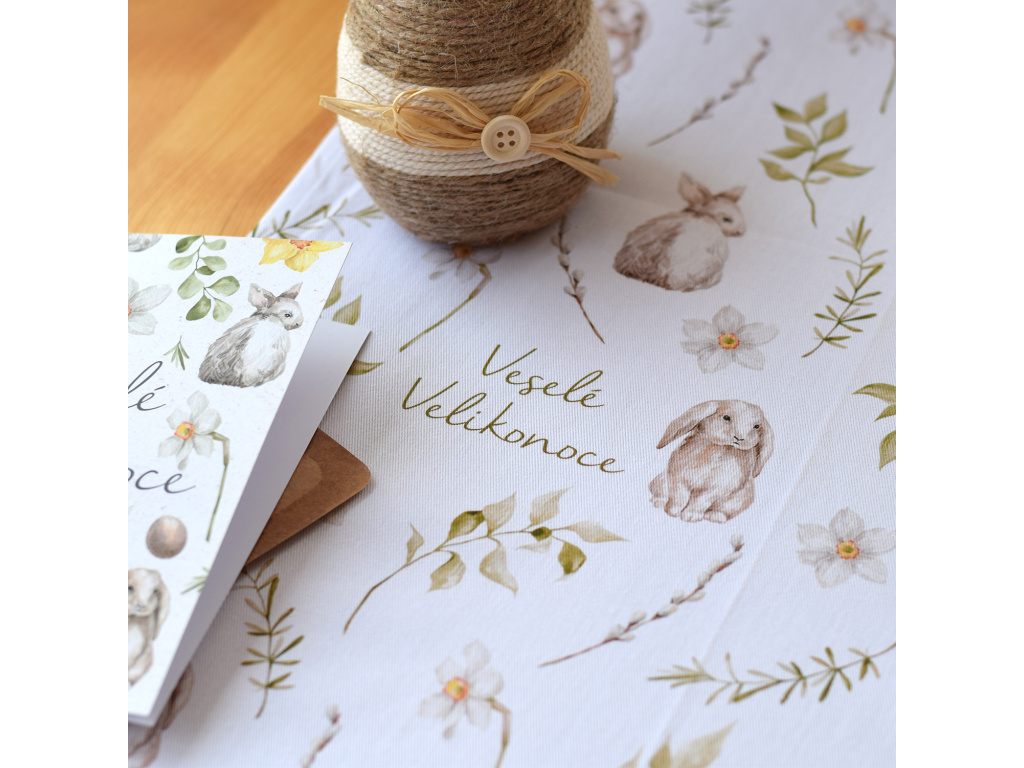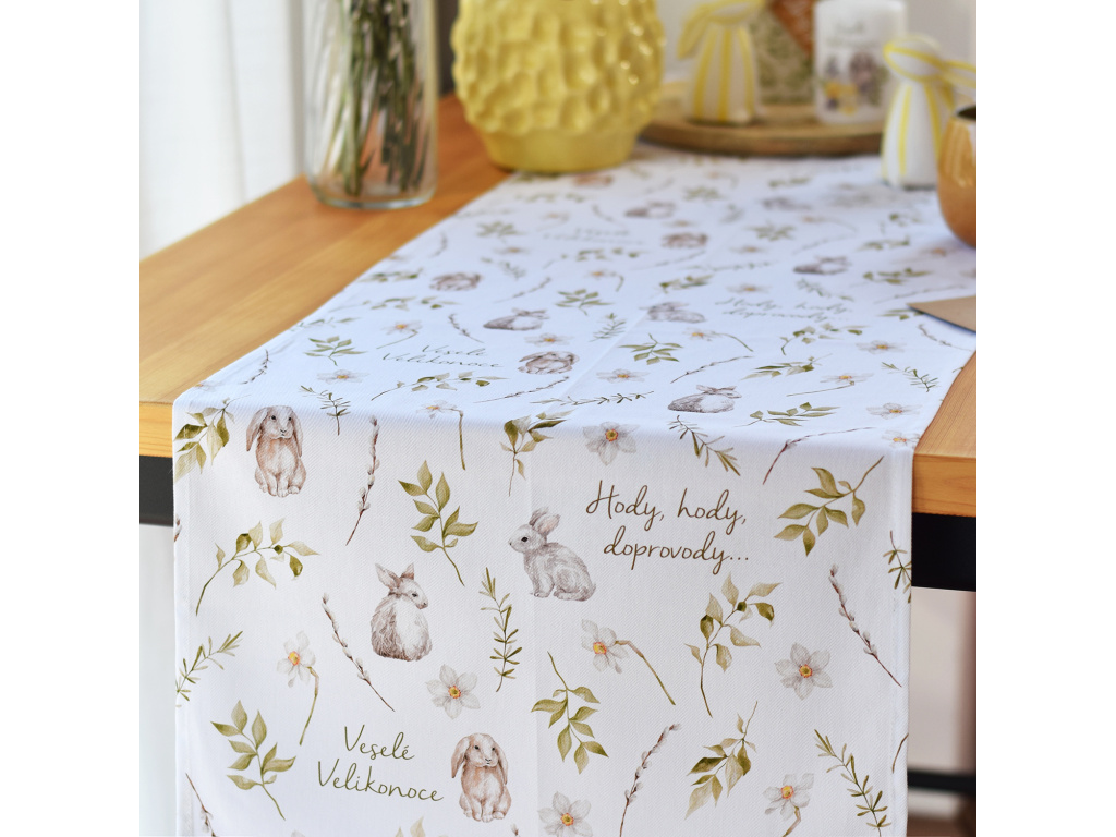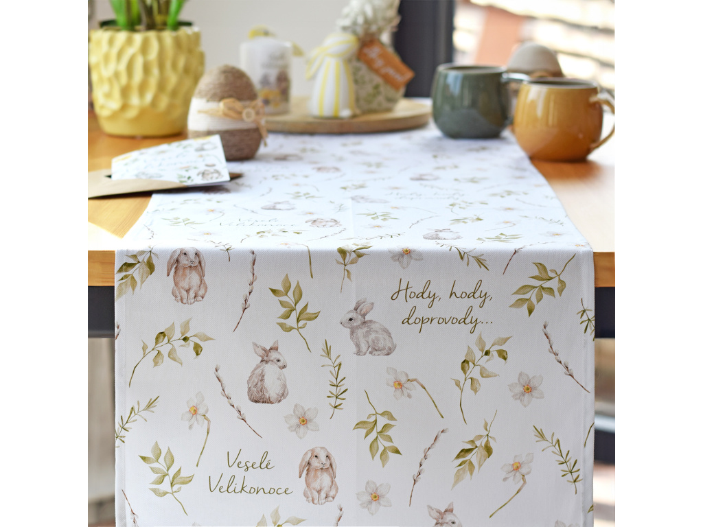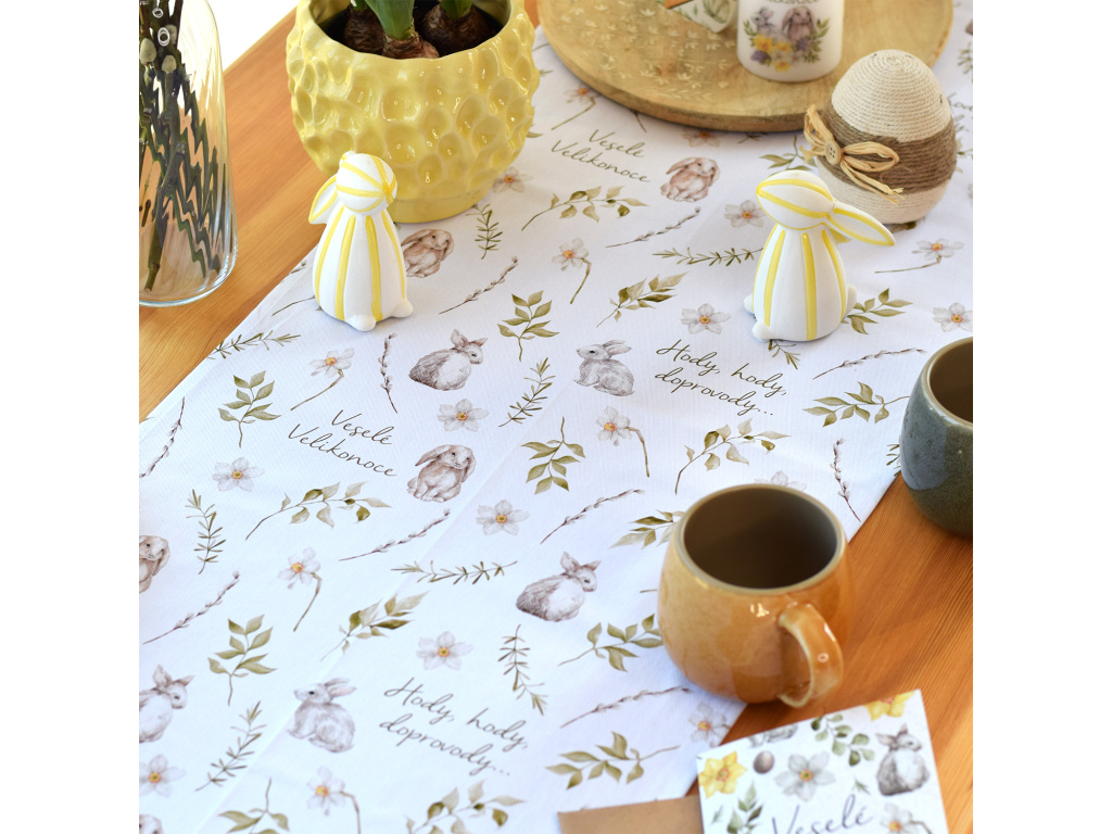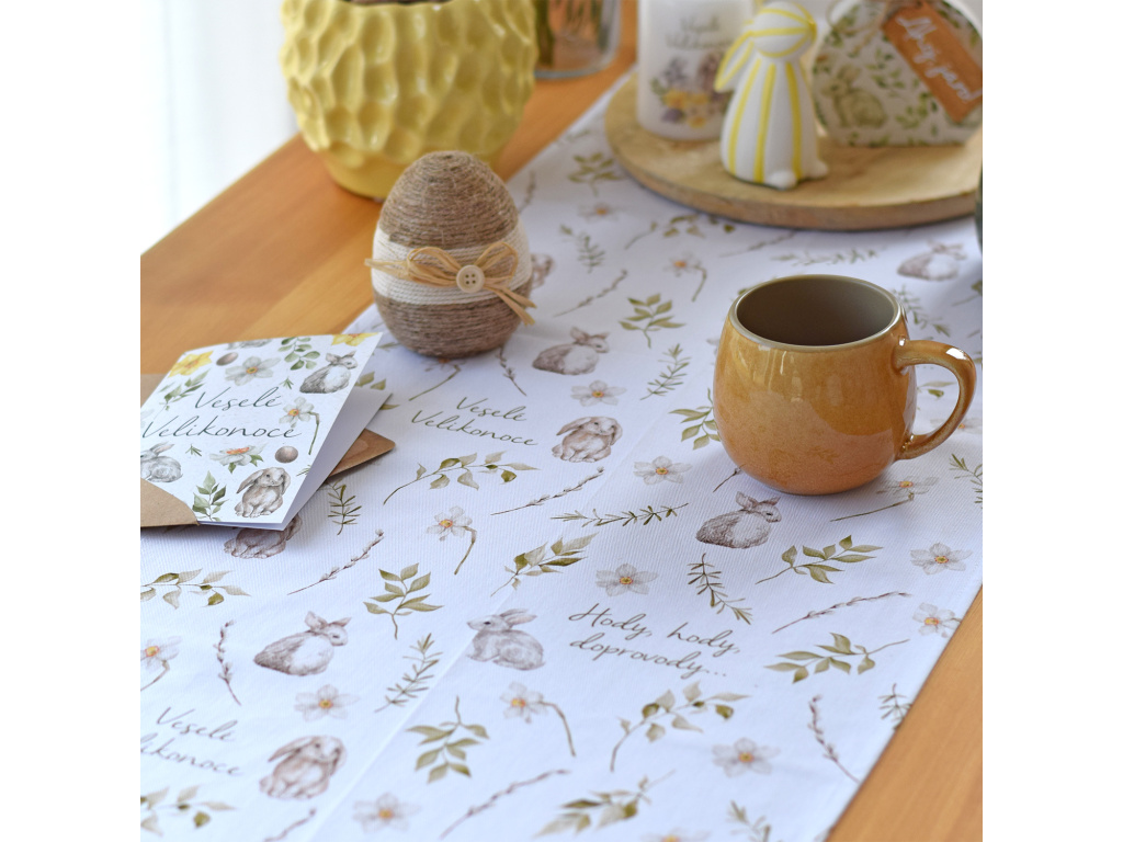 Bavlněný běhoun s jemným akvarelovým motivem zajíčků, květin a zelených větviček vytvoří útulnou atmosféru a stane se krásným základem vaší velikonoční výzdoby.