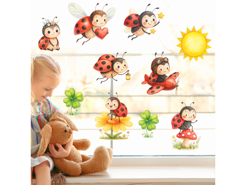 Samolepka Berušky promění obyčejné okno v hravou scénu plnou veselých berušek, sluníčka a květin.
