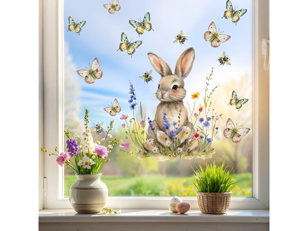 Nechte jaro rozkvést přímo na vašem okně. Něžný králíček usazený v rozkvetlé louce, obklopený motýly a pilnými včelkami, vytvoří v interiéru jemnou a svěží atmosféru plnou světla a radosti.