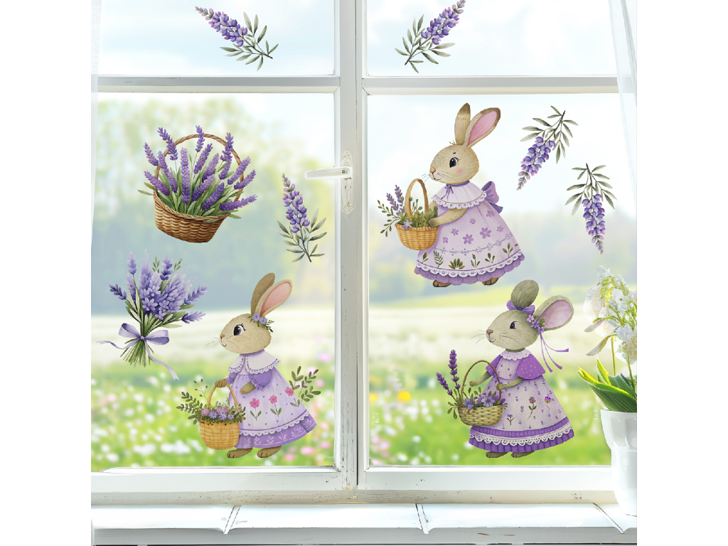 Vneste do svého domova vůni a něhu jara s okenní dekorací Levandulové jaro. Půvabné králičí slečny v levandulových šatičkách, doplněné košíčky plnými květů a jemnými snítkami levandule, vytvoří na vašem okně romantickou a svěží atmosféru.