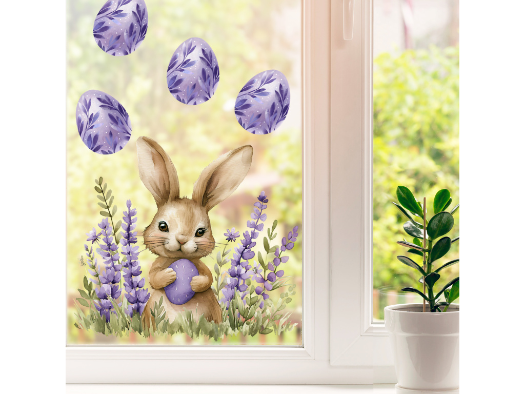 Tento malovaný zajíček v levandulových tónech potěší děti i dospělé. Ozdobte si svá okna s touto efektivní samolepkou!