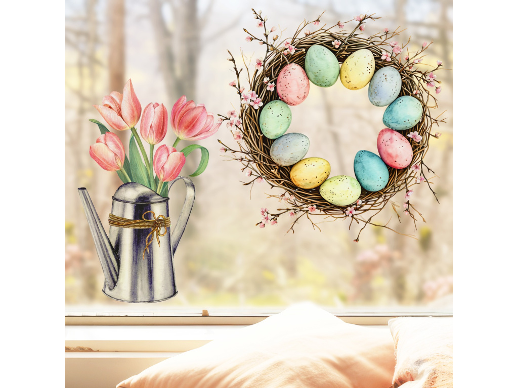 Sada velikonočního věnce a tulipánů vás hned naladí na velikonoční náladu. Ozdobte si svá okna s touto efektivní samolepkou!