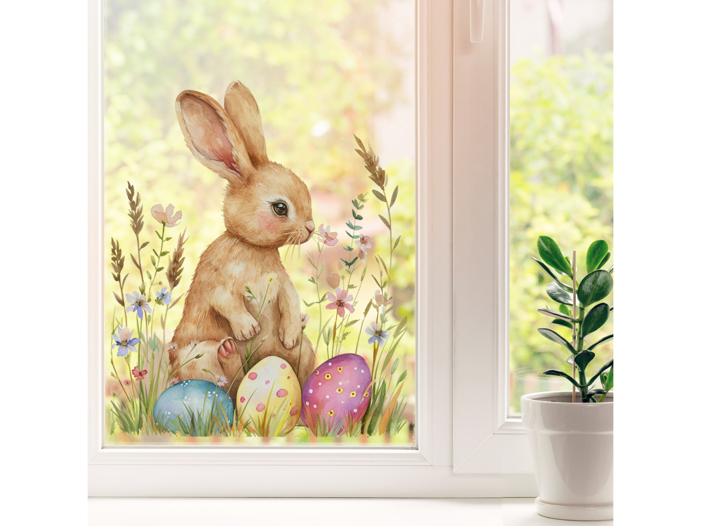 Vytvořte si doma krásnou jarní atmosféru se samolepkou na okno s motivem malovaného zajíčka na louce.
