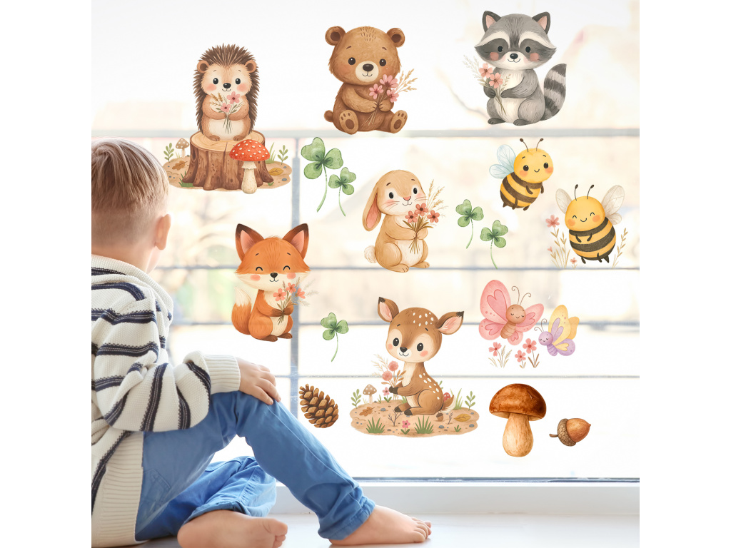 Samolepky můžete rozmístit samostatně nebo vytvořit vlastní lesní scénu. Skvěle vyniknou na okně, kde jemně propouští světlo a zároveň dodají prostoru hravý charakter.