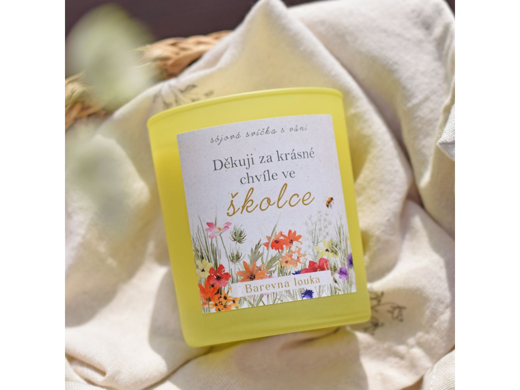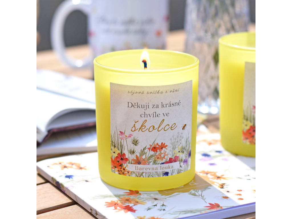 Pokud hledáte kvalitní a zajímavý dárek pro paní učitelku ze školky... Vřele doporučujeme tuto vonnou přírodní svíčku ze sójového vosku. Nádherně voní po květinách a je zalitá do krásného matného žlutého skla. Proto tato svíčka vypadá velmi jedinečně a díky žluté, citrónové barvě velmi svěže a pozitivně.