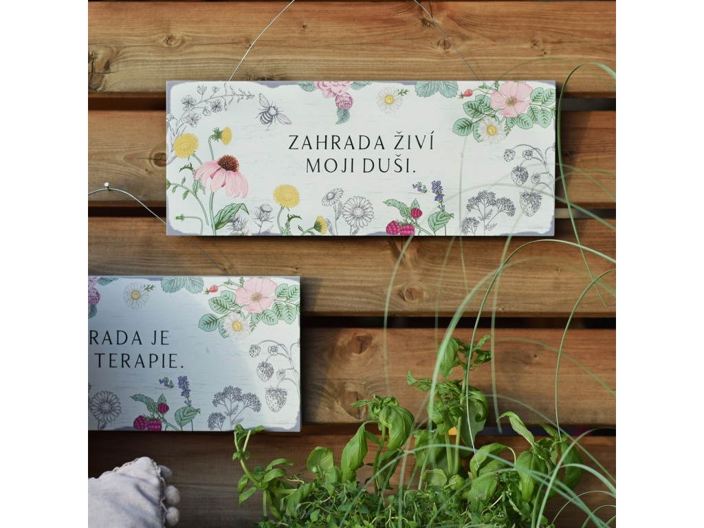Zahradní cedule s citátem - Zahrada živí moji duši.