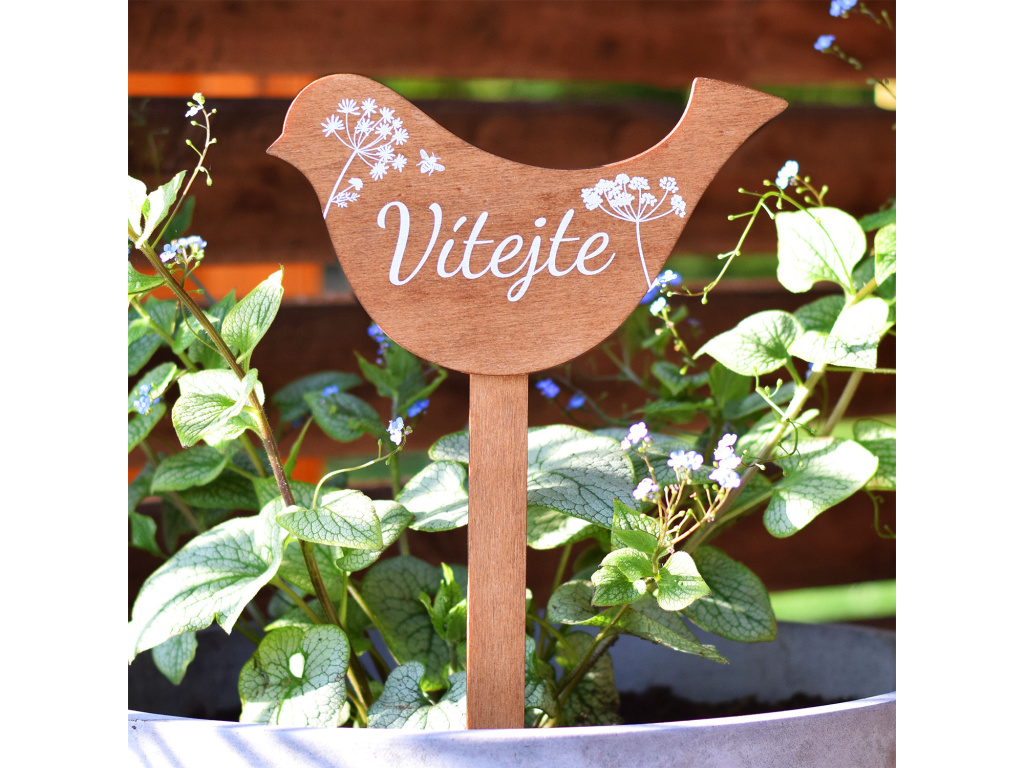 Dřevěný zápich pro ozdobení truhlíků a květináčů s českým nápisem "Vítejte"
